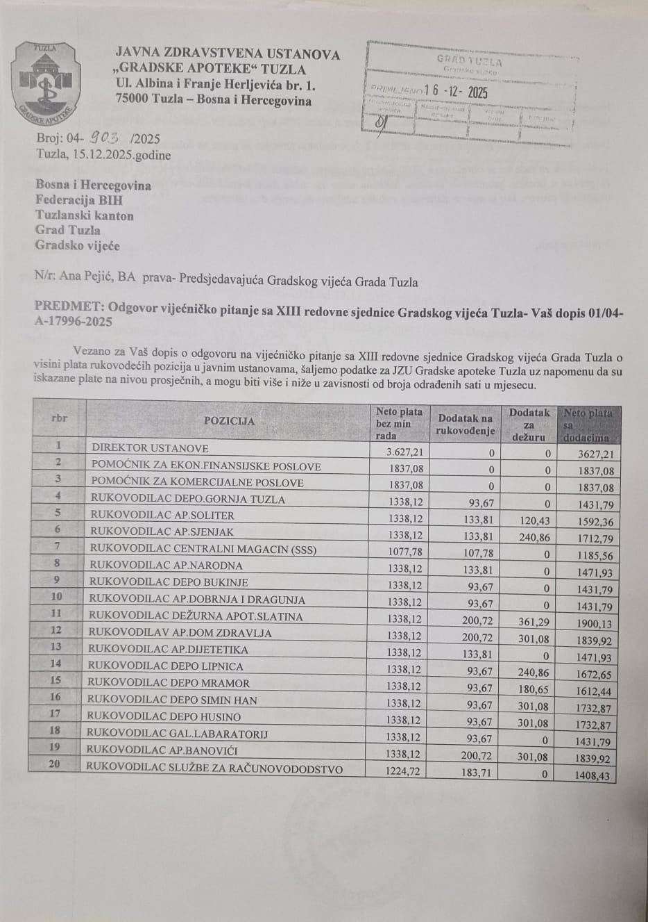 Neto plata direktora JZU „Gradske apoteke“ Tuzla je 3.627,21 KM. Topli obrok iznosi 10 KM po danu, a prevoz u visini mjesečne karte za prevoz.