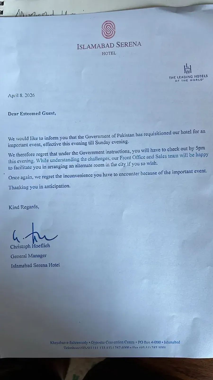 "Pakistanska vlada je zatražila smještaj u našem hotelu za važan događaj", pisalo je na A4 listu papira koji je podijeljen gostima hotela. Jedan gost je tokom provjere saznao da je odmah rezervirano 459 soba.