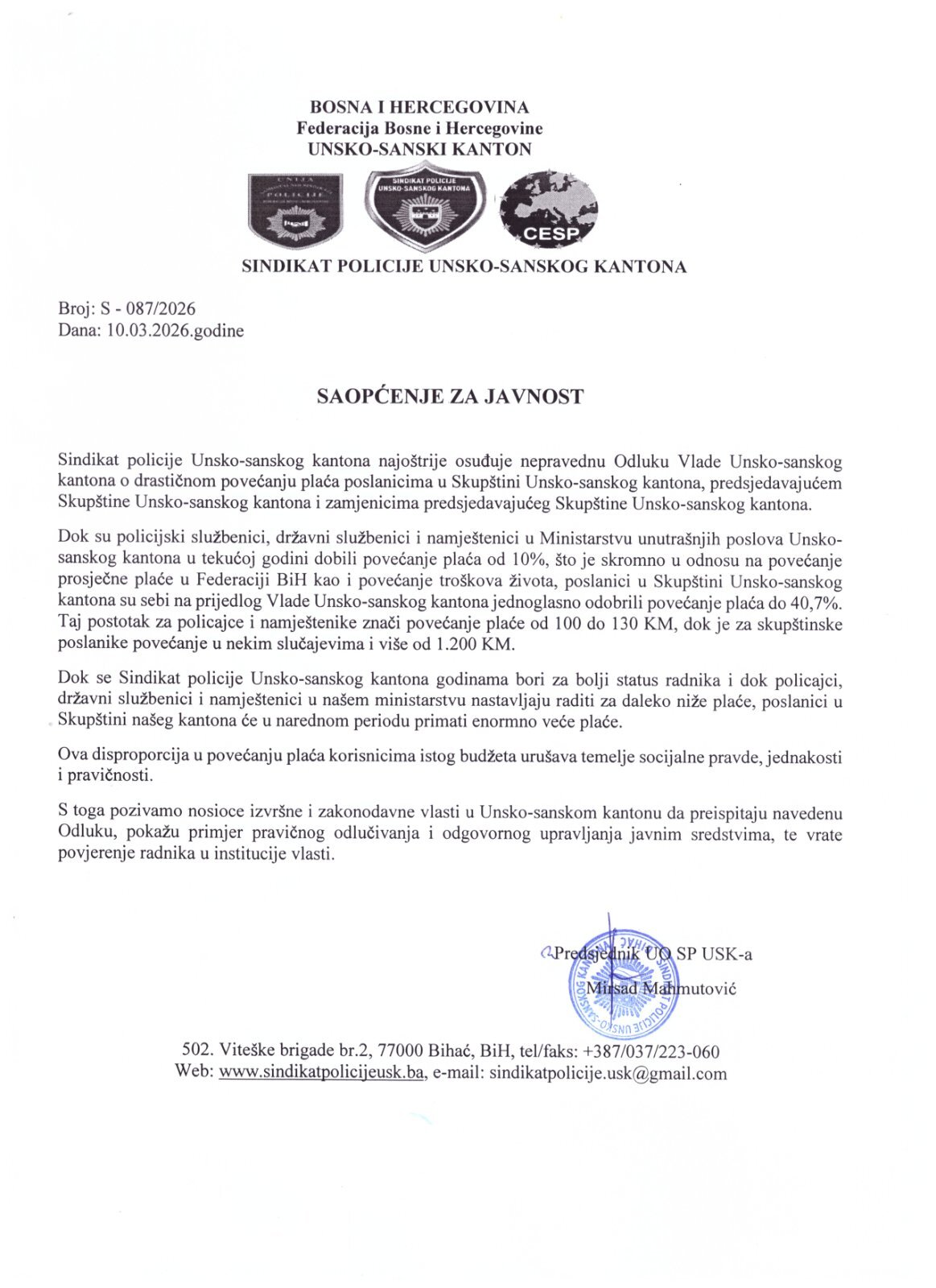 Saopćenje je potpisao predsjednik Upravnog odbora Sindikata policije Unsko-sanskog kantona Minsad Mahmutović.