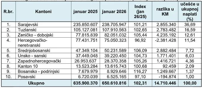 Iz Porezne uprave Federacije Bosne i Hercegovine (PU FBiH) saopćili su da su porezni obveznici u ovom entitetu prošli mjesec uplatili 650,61 milion KM javnih prihoda, što je u odnosu na januar 2025. više za 14,71 milion KM, odnosno za 2,31 posto. U dolje priloženoj tabeli sadržani su podaci o uplati javnih prihoda tokom prošlog mjeseca u svakom kantonu.