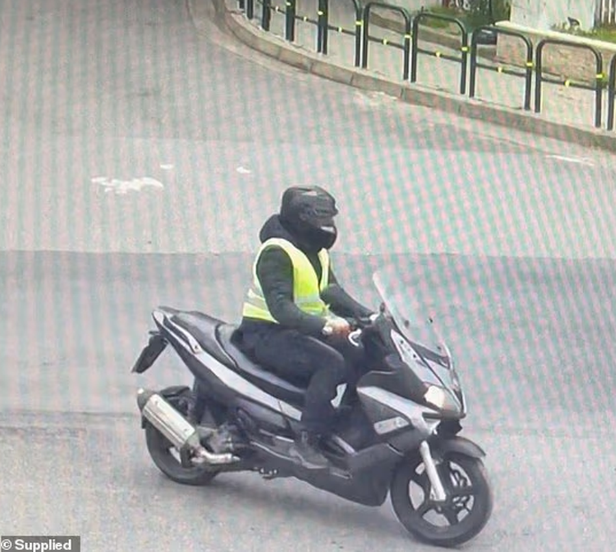 Na snimku se vidi prestravljeno osoblje i počinilac kako bježe, a zatim se voze na motoru.