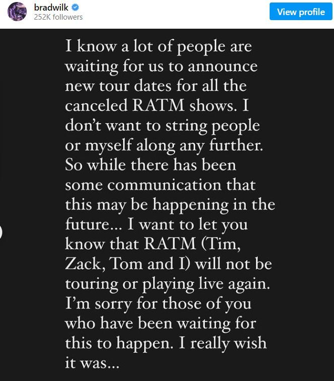 "Znam da puno ljudi čeka da objavimo nove datume turneje nakon što smo otkazali nastupe grupe RATM. Ne želim dalje gnjaviti ljude ili sebe. Iako je bilo nekih naznaka da bi se koncerti mogli održati u skorijoj budućnosti, želim vas obavijestiti da RATM (Tim, Zack, Tom i ja) više nećemo ići na turneju niti svirati uživo. Žao mi je zbog svih vas koji su čekali da se održe ti koncerti. Stvarno bih volio da jesu…", napisao je Wilk.
