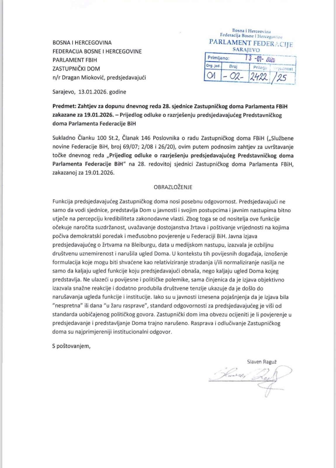 Predsjednik Hrvatske republikanske stranke (HRS) Slaven Raguž danas je podnio zahtjev za dopunu dnevnog reda 28. Sjednice Zastupničkog doma Parlamenta FBiH zakazane za 19. januar 2025. s prijedlogom odluke o razrješenju predsjedavajućeg Predstavničkog doma Parlamenta FBiH Dragana Miokovića.