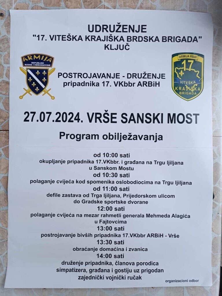 Udruženje „17 Viteška Krajiška brigada“ organizuje tradicionalno druženje pripadnika ove brigade koje će se ove godine prvi put održati u Sanskom Mostu.