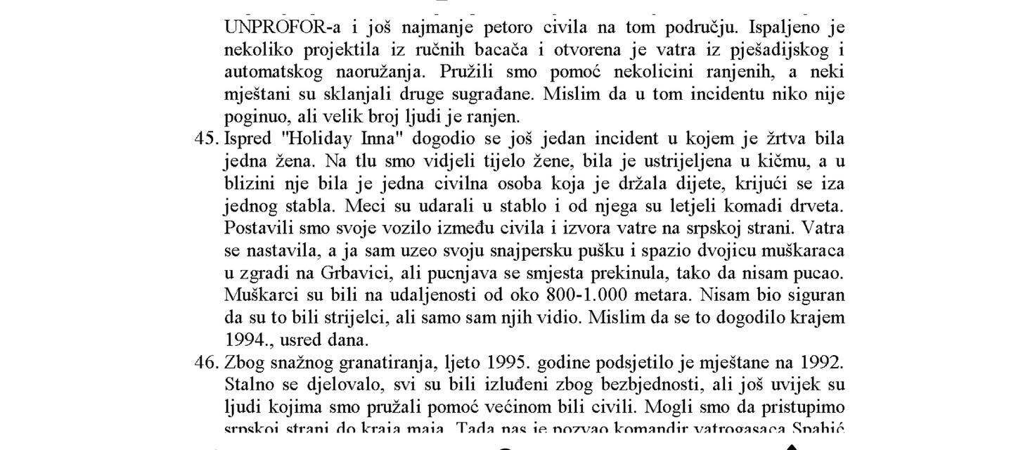 Dalje u svjedočenju navodi da je tokom perioda 1994–1995. više puta posmatrao strane državljane koji su dolazili na položaje na srpskoj strani i pucali na civile u Sarajevu, te da su se lokalne oružane formacije prema njima odnosile s posebnom pažnjom.