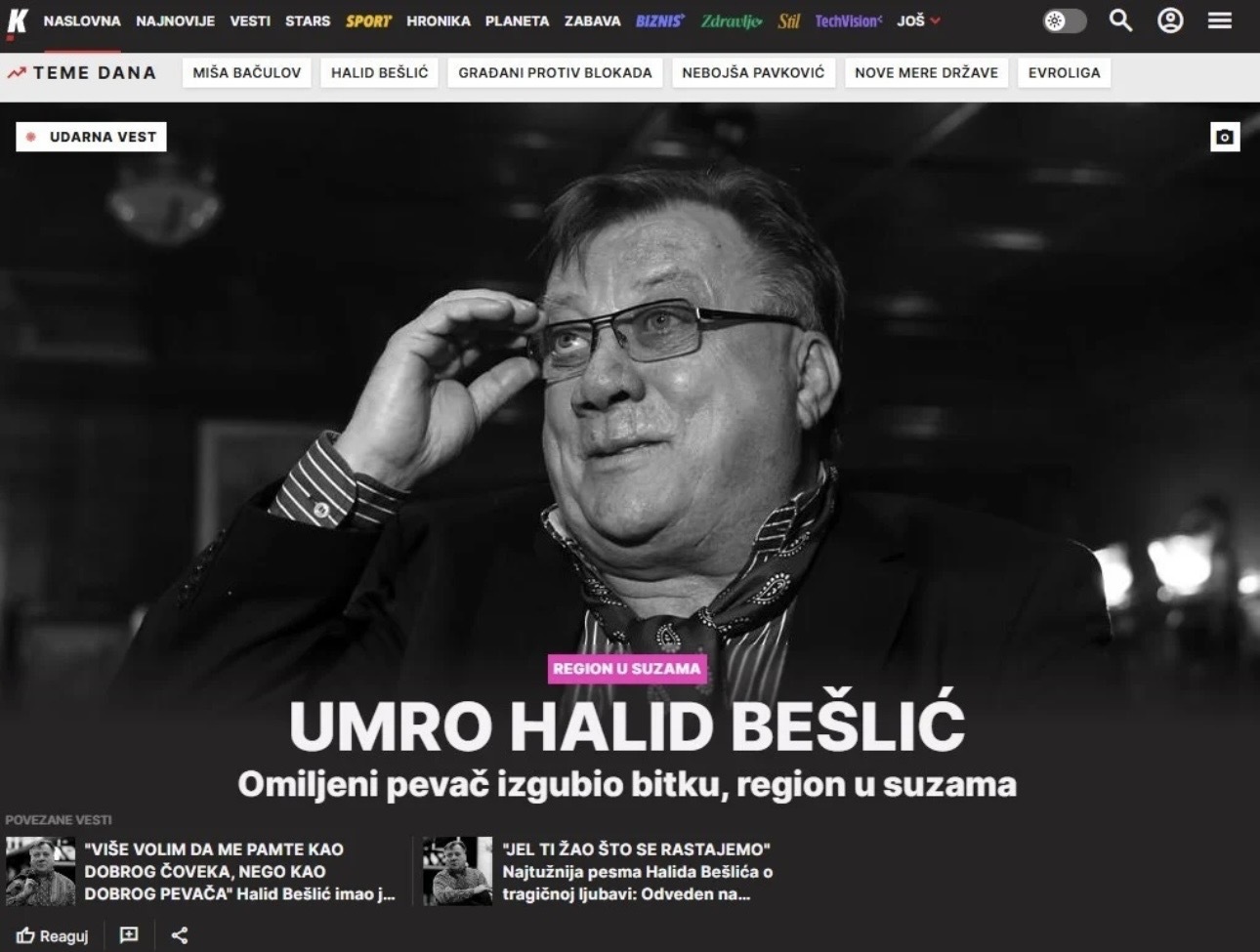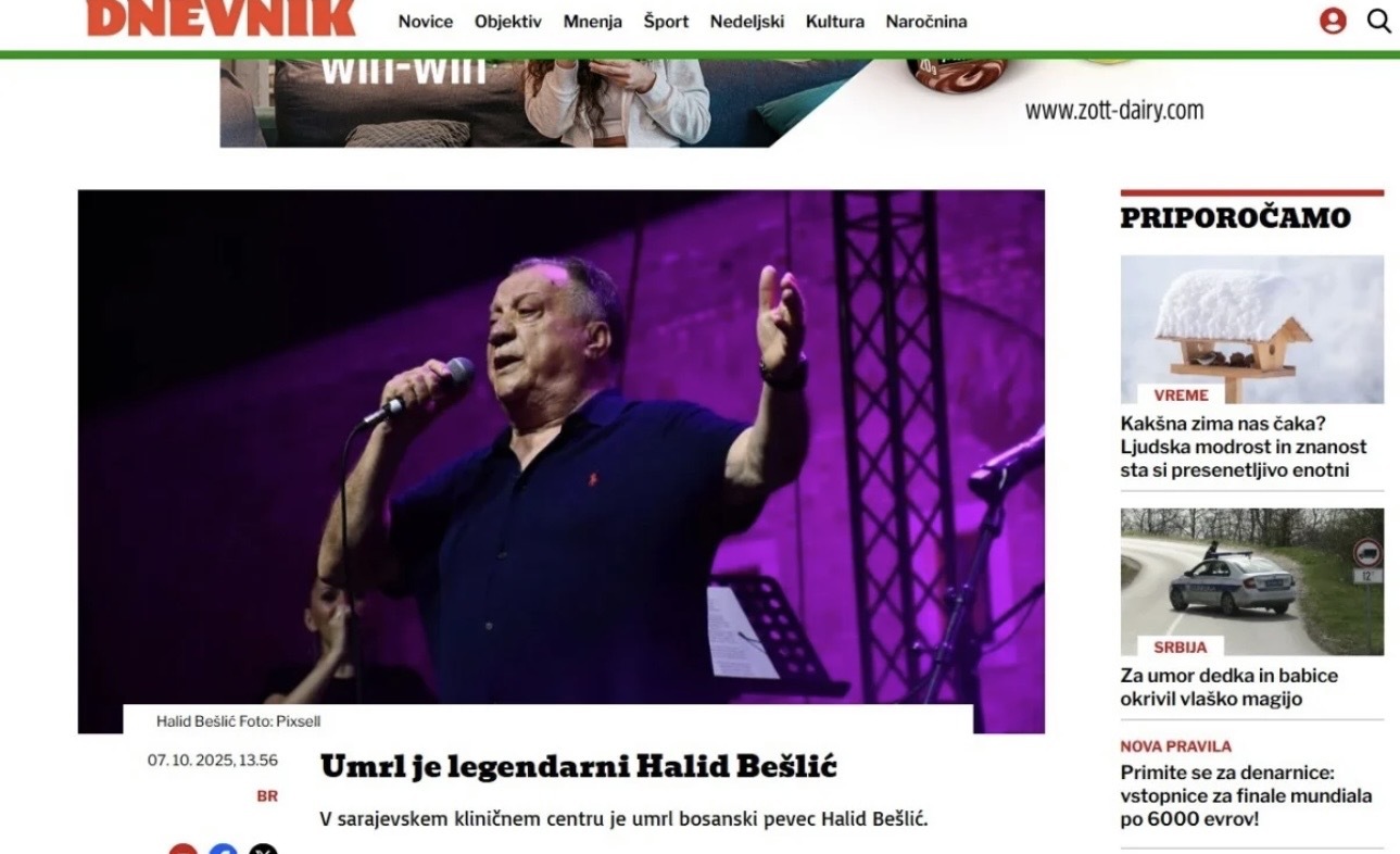 Smrt legendarnog bosanskohercegovačkog pjevača narodne muzike Halida Bešlića danas je glavna vijest u gotovo svim medijima regiona, što svjedoči o njegovoj veličini i snažnom utjecaju koji je imao daleko van granica domovine.