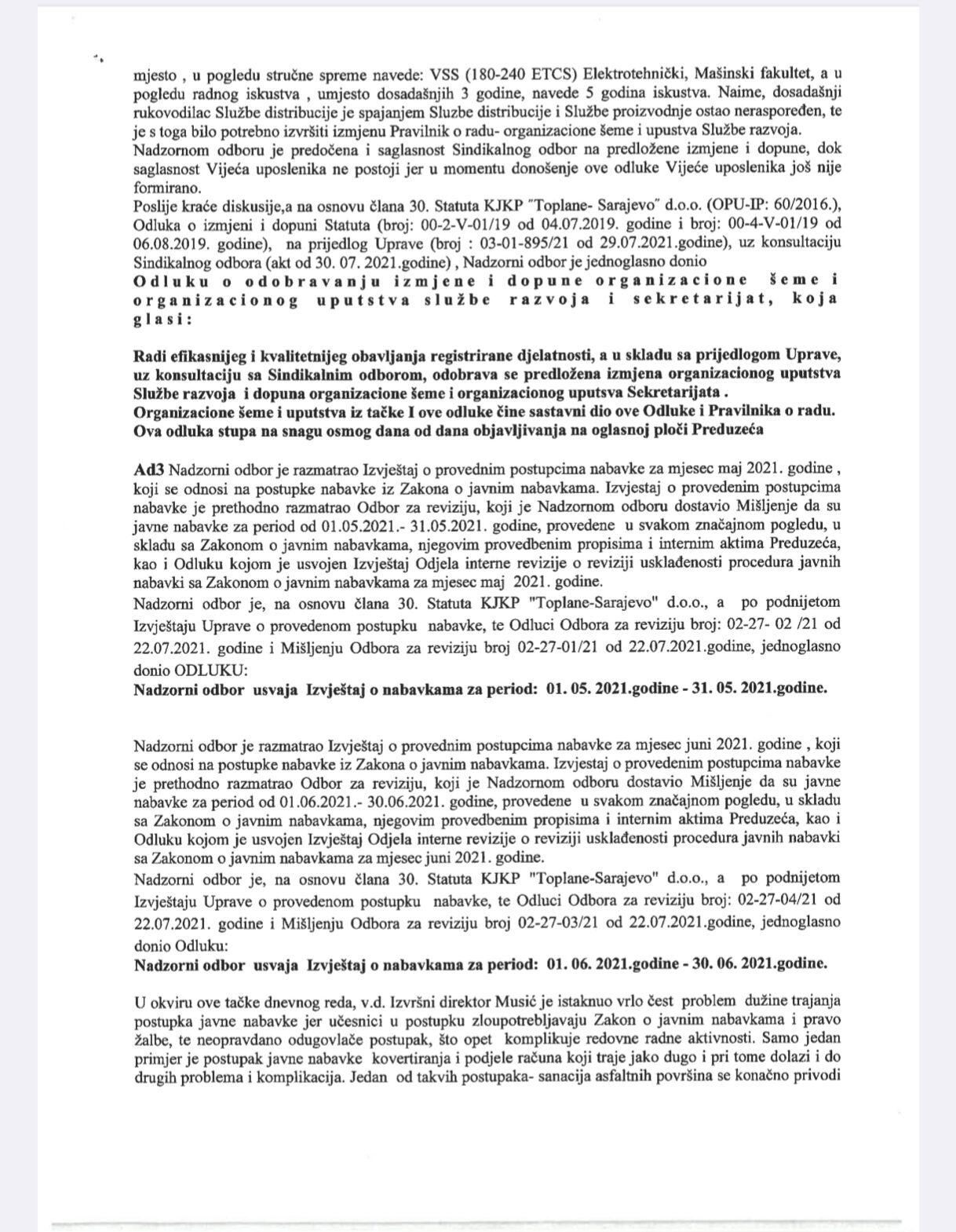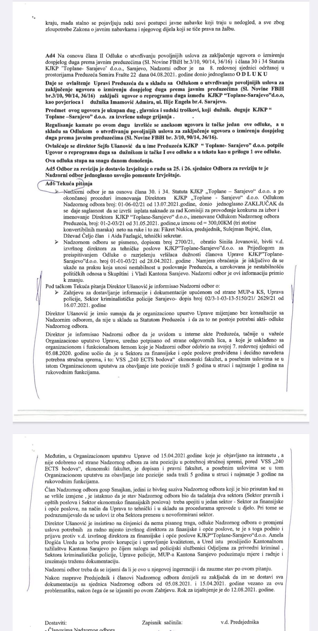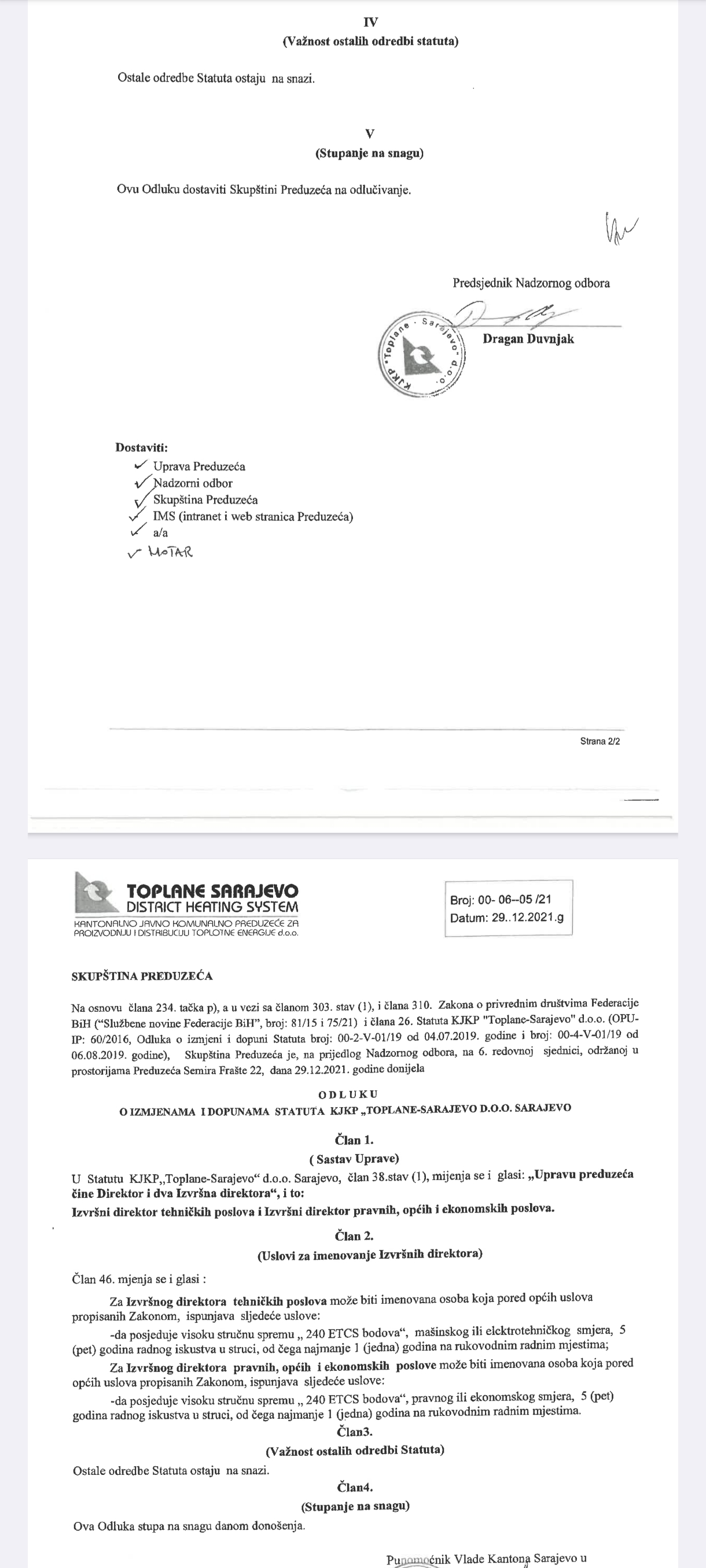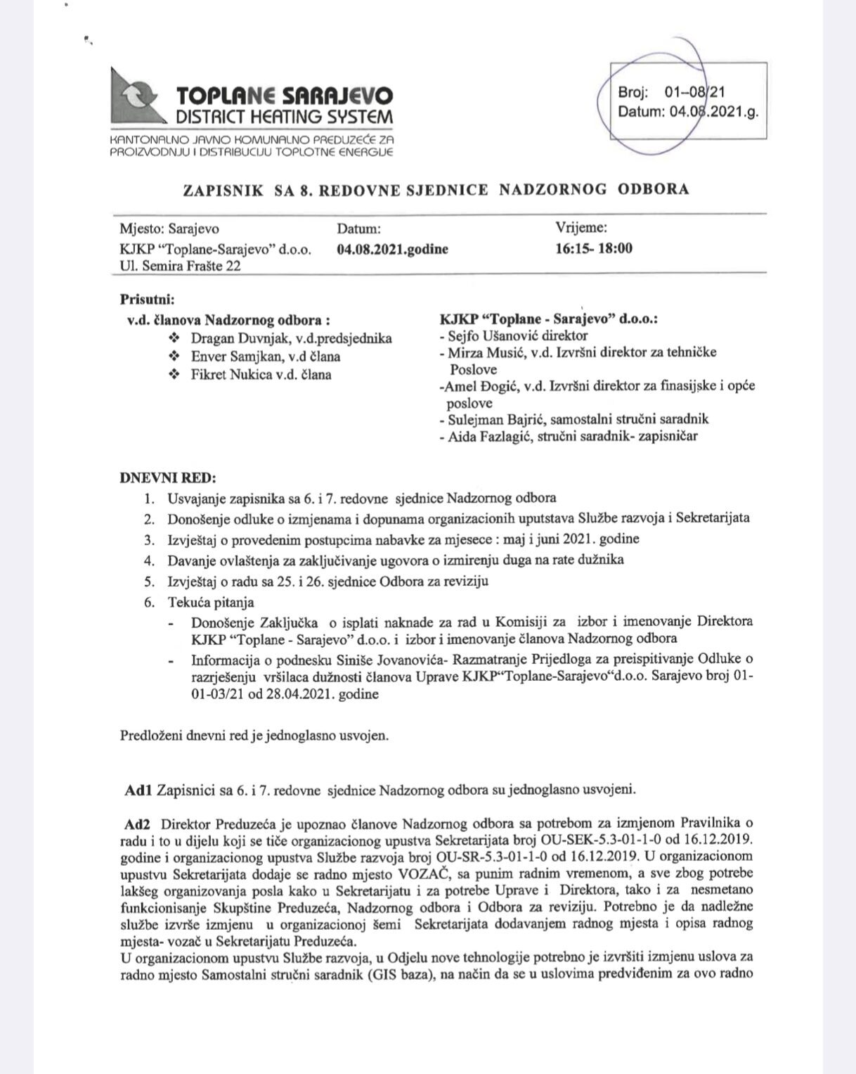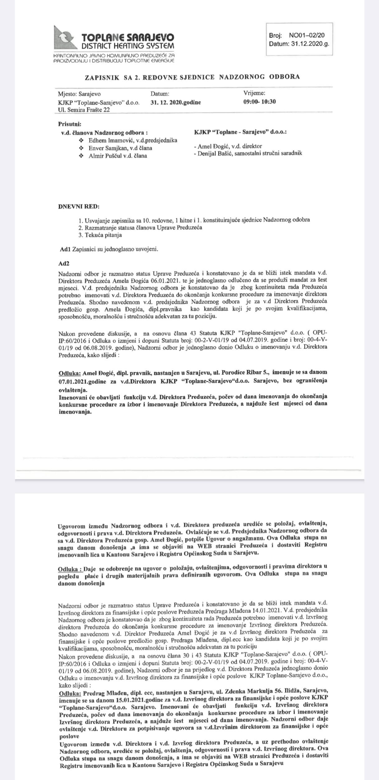 Članovi Nadzornog odbora koji su donosili odluke o imenovanjima u relevantnom periodu bili su Edhem Imamović (v.d. predsjednik), Enver Smajkan i Almir Pušcul kao vršioci dužnosti članova, a potom i Dragan Duvnjak, Fikret Nukica i Enver Smajkan. U dokumentima koje su dostavili uposlenici nalaze se zapisnici sa sjednica, odluke o imenovanjima te izmjene i dopune Statuta preduzeća.