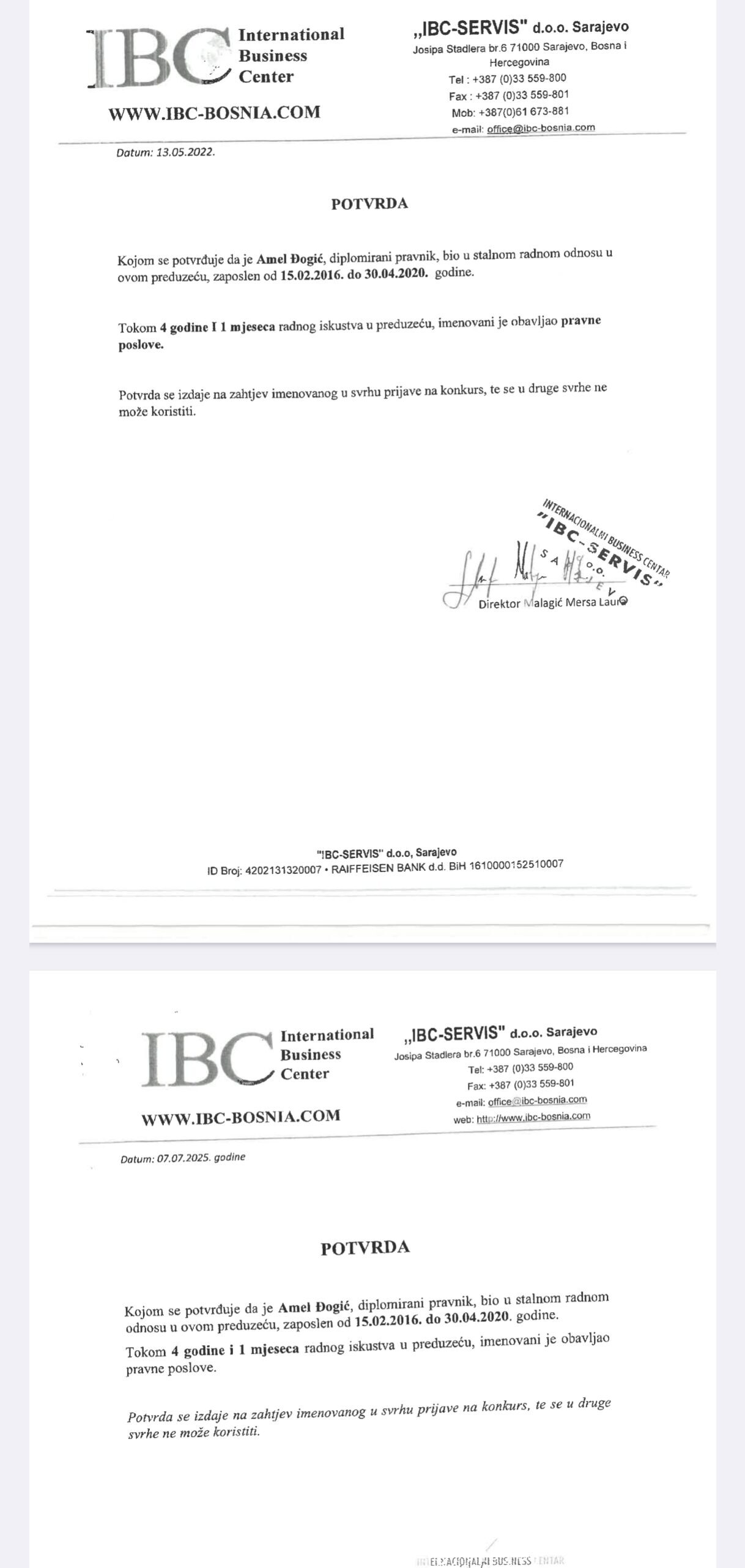 Potvrde o radnom iskustvu, koje je izdala privatna firma IBC-Servis d.o.o. Sarajevo, navode da je Đogić bio zaposlen u periodu od februara 2016. do aprila 2020. godine, gdje je obavljao pravne poslove. Međutim, u tim dokumentima ne navodi se da je obavljao rukovodne funkcije niti koliko je eventualno iskustva stekao na rukovodnim pozicijama.