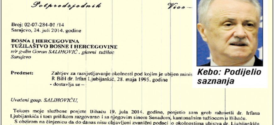 Prije sedam godine potpredsjednik Federacije BiH Mirsad Kebo uputio je prijedlog Glavnom tužiocu BiH, a koji se odnosi na ekshumaciju tela ubijenog ministra spoljnih poslova RBiH Irfana Ljubijankića. Kebo je dobio usmenu suglasnost porodice rahmetli Ljubijankića za ekshumaciju kako bi se utvrdilo na koji način je ubijen. Nije poznato šta je uradio tadašnji glavni tužilac sa Kebinom prijedlogom. Po svemu sudeći-ništa. A i Kebo je otišao u političku penziju i povijest.