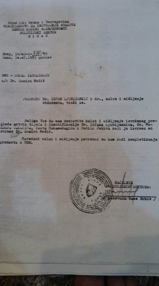 Obdukcija tijela dr. Irfana Ljubijankića, dr. Mensura Šabulića, Izeta Mehmedagića i Fadila Pekića nikada nije izvršena iako je postojala naredba. Tadašnji patolog bihaćke bolnice dr. Samira Mešić izjavila je autoru ovog teksta da se ne sjeća da li je radila obdukciju tijela rahmetli Irfana Ljubijankića!?