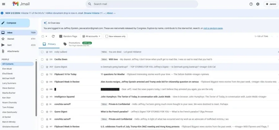 Na Jmail.Worldu možete pregledavati Epsteinov inbox kao da je vaš vlastiti. Bočna traka s lijeve strane ističe ljude s kojima je komunicirao: njegovog partnera i saradnika Maxwella, bivšeg predsjednika Harvarda Larryja Summersa, eminentnog lingvistu Noama Chomskyja, pa čak i Woodyja Allena i Micka Jaggera.