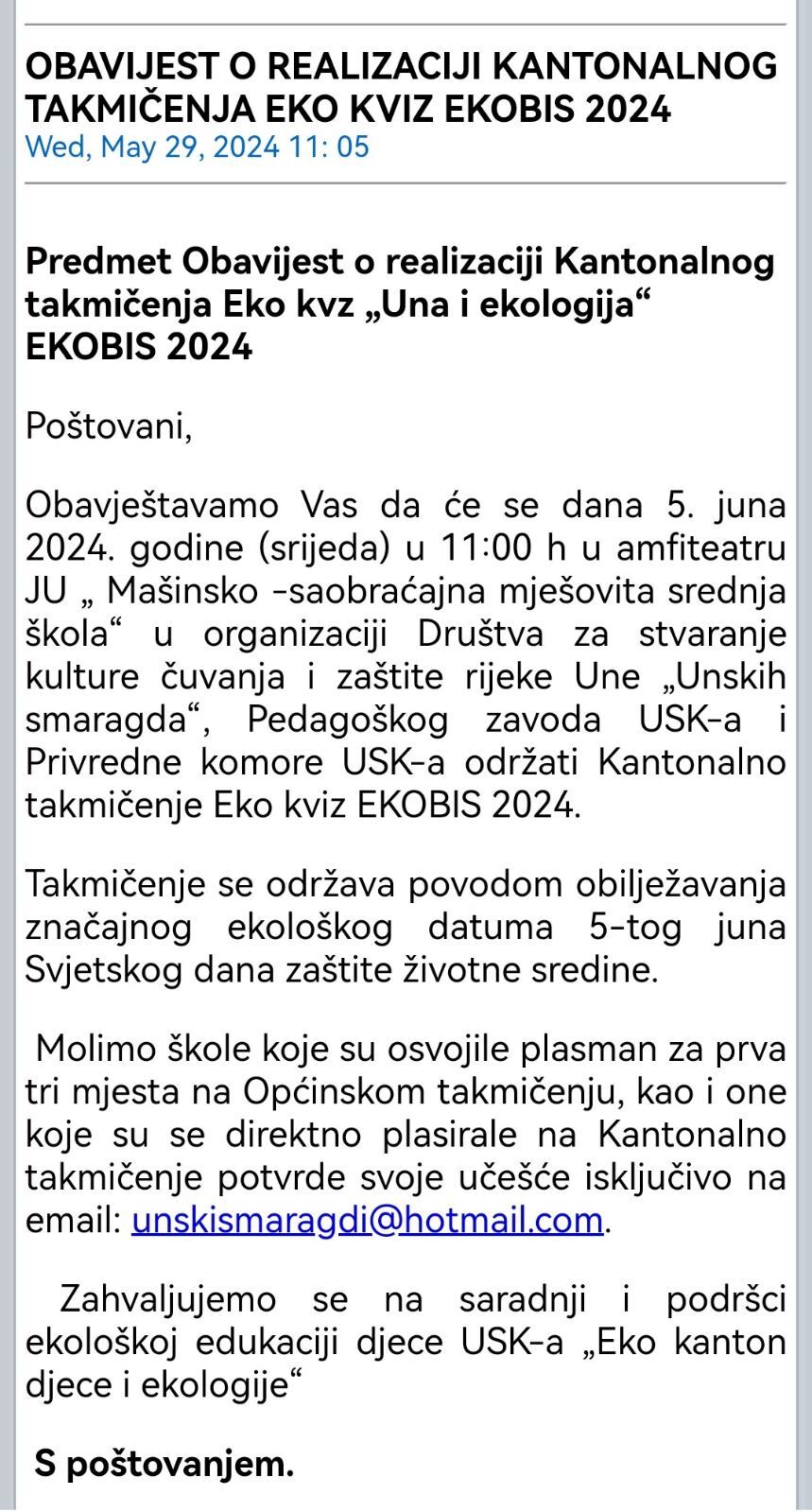 No, istovremeno, tri sanske osnovne škole „Prva sanska“, „ 5.oktobar“ i „Mahala“ zbog par stotina KM ne mogu sutra poslati svoje najbolje učenike na kantonalno takmičenje u Bihać na Eko kviz „Una i ekologija“ na ovogodišnjem EKOBIS-u.