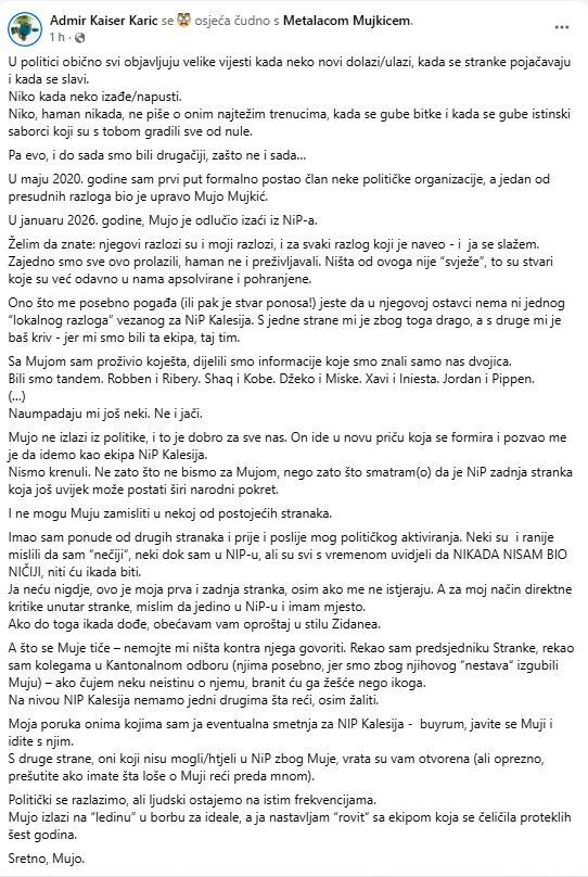 „On ide u novu priču koja se formira i pozvao me je da idemo kao ekipa NiP Kalesija. Nismo krenuli. Ne zato što ne bismo za Mujom, nego zato što smatram(o) da je NiP zadnja stranka koja još uvijek može postati širi narodni pokret. I ne mogu Muju zamisliti u nekoj od postojećih stranaka“, napisao je Karić, ostavljajući otvoren prostor i za vlastite buduće političke odluke.