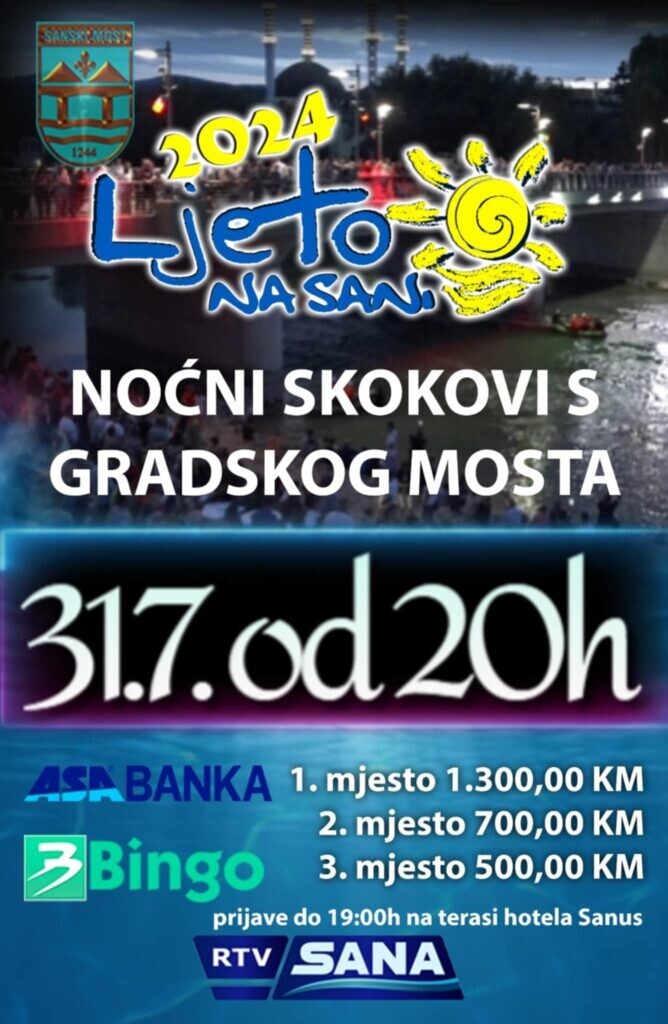 Podsjećamo, da su u svim ranijim godinama noćni skokovi s Gradskog mosta bili velika atrakcija i da nadmetanje hrabrih skakača privuče nekoliko hiljada Sanjana i brojnih gostiju koji tokom ljeta borave u gradu na devet rijeka, ali i susjednih općina. Na kraju recimo da svi skakači trebaju biti u 19 sati na terasi hotela Sanus. Sve informacije se mogu dobiti na brojeve telefona: 061 / 613 – 656 i 060 / 30 43 930