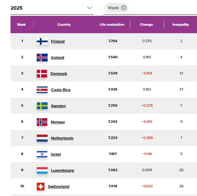 Finska je rekordni deveti put zaredom proglašena najsretnijom zemljom na svijetu, dok je Island na drugom, a Danska na trećem mjestu na rang listi koju sastavlja Istraživački centar za blagostanje Univerziteta u Oxfordu, a koja je uključena u godišnji izvještaj o globalnoj sreći.