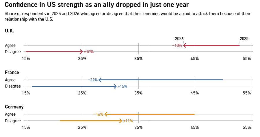 U Velikoj Britaniji, Francuskoj i Njemačkoj, negativne percepcije SAD-a su važnije od pozitivnih po ključnim mjerama, uključujući i to da li brani demokratiju, dijeli njihove vrijednosti i djeluje kao pouzdan saveznik.