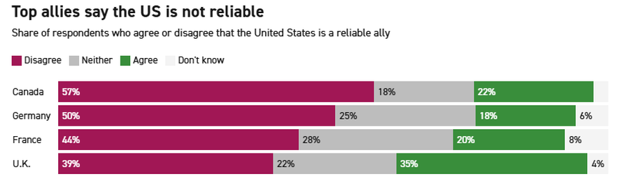 U svim anketiranim zemljama, mnogo više ljudi je opisalo SAD kao nepouzdanog saveznika nego kao pouzdanog, uključujući polovinu odraslih ispitanika u Njemačkoj i 57 posto u Kanadi.