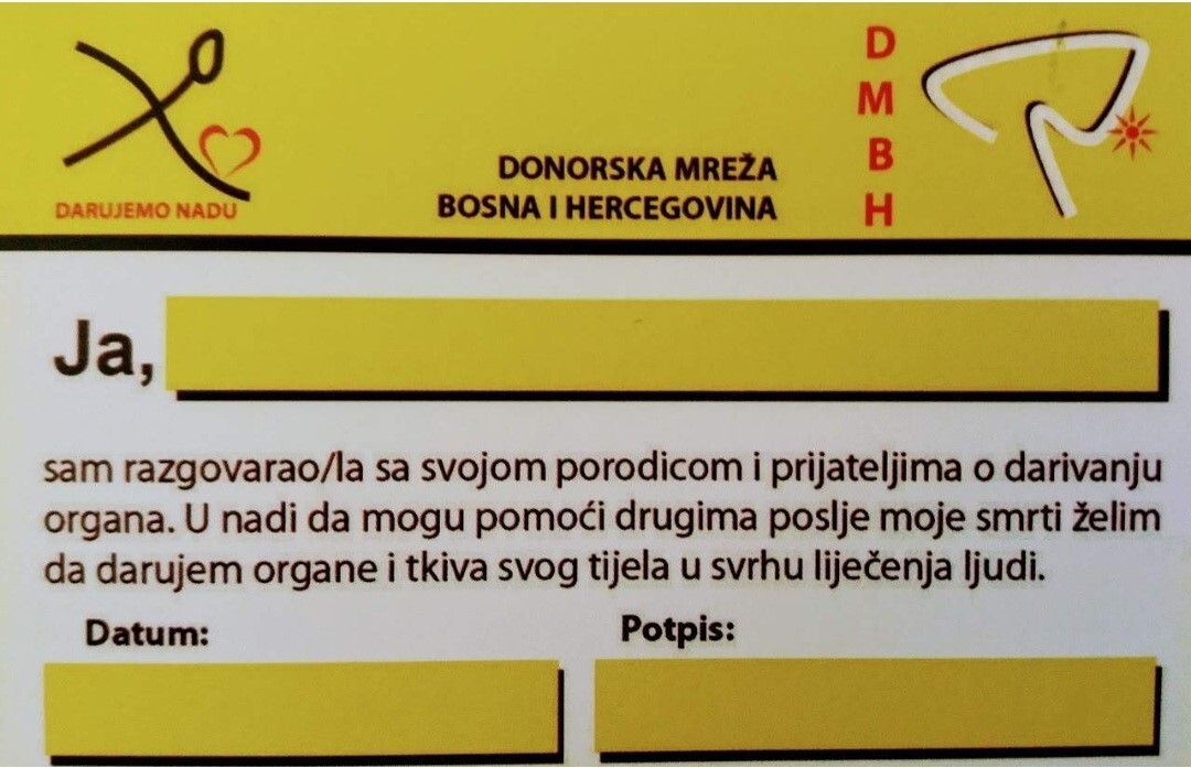 Do sada je u BiH potpisano 80.000 donorskih kartica, kojima građani daju saglasnost za doniranjem organa nakon smrti, dok je u posljednjih godinu dana 1.000 ovih kartica podijeljeno putem pošte.