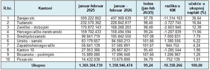 Uplate javnih prihoda u periodu januar - februar 2026. godine u odnosu na period januar - februar 2025. godine po kantonima prikazane su u sljedećoj tabeli:
