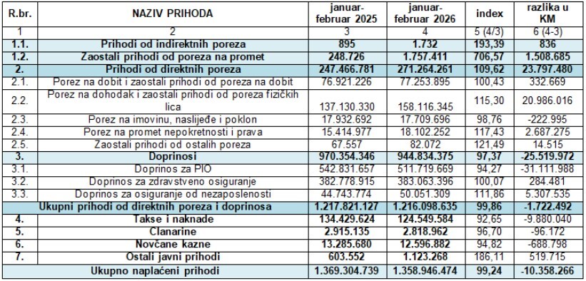 Struktura javnih prihoda u periodu januar-februar 2026. godine u odnosu na period januar-februar 2025. godine prikazana je u sljedećoj tabeli: