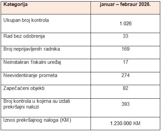 U periodu januar-februar 2026. godine izvršeno je 1.026 inspekcijskih nadzora. Rezultati inspekcijskih nadzora prikazani su u sljedećoj tabeli: