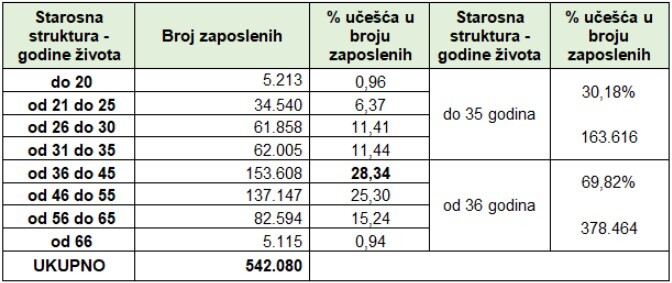 Prema službenim evidencijama Porezne uprave Federacije BiH na dan 28.2.2026. godine do 35 godina života zaposleno je 163.616, ili 30,18%, a preko 36 godina života zaposleno je 378.464 ili 69,82%. Na dan 28.2.2026. godine u Federaciji BiH zaposleno je 300.160, ili 55,37% muškaraca i 241.920 ili 44,63% žena.