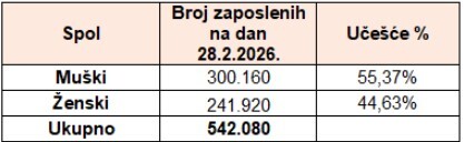 Broj zaposlenih prema prebivalištu zaposlenika na dan 28.2.2026. godine je 542.080.
