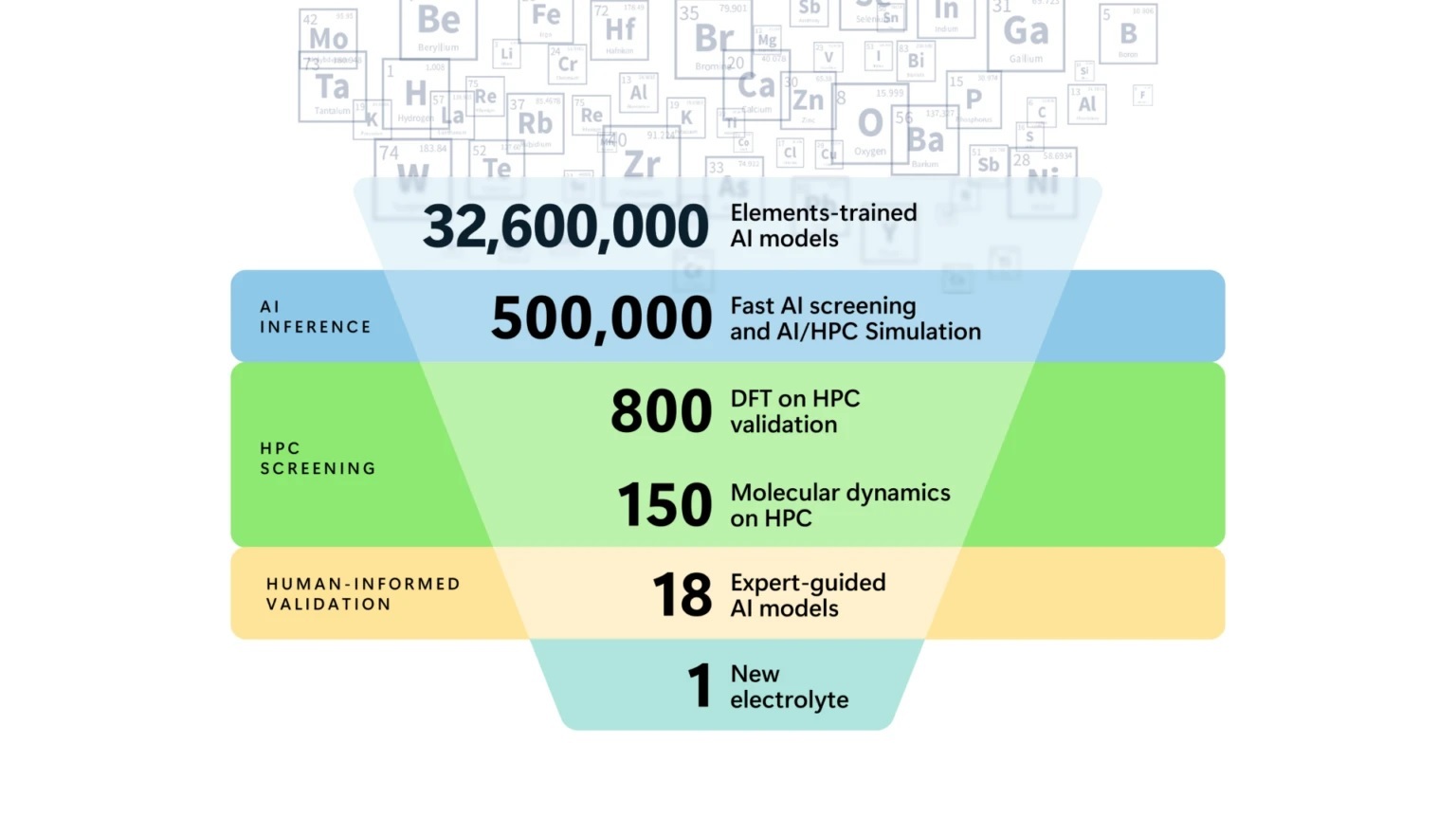 Microsoftovi stručnjaci su, uz pomoć superračunara i umjetne inteligencije, uspjeli, od 32 miliona potencijalno primjenjivih materijala-elektrolita, suziti izbor na 18 kandidata u samo 80 sati računanja. Bez umjetne inteligencije, za ovaj posao bi naučnicima bile potrebne decenije.