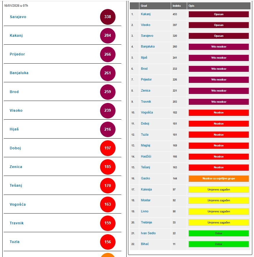 Mjerenje u 7.00 sati pokazalo je da je indeks kvaliteta vazduha u Sarajevu 338, Kaknju 284, Prijedoru 266, Banjoj Luci 261, Bosanskom Brodu 259, Visokom 239, Ilijašu 216, Doboju 197, Zenici 185, Tešnju 170, Vogošći 163, Travniku 159 i Tuzli 156.