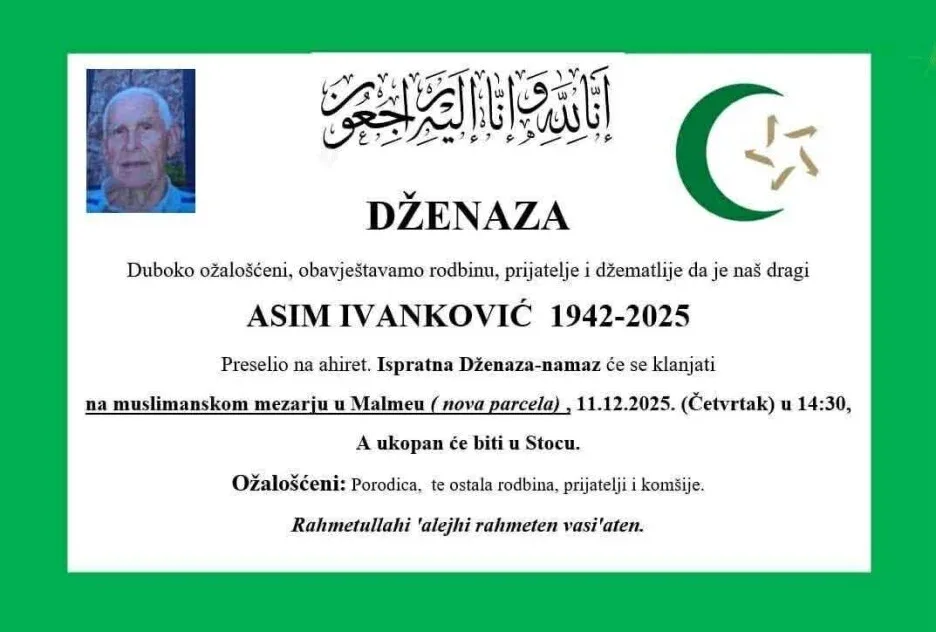 Na novom Gradskom mezarju Radimlja-Poprati u Stocu, koje je izgrađeno tokom prošle godine, u nedjelju će nakon ikindija-namaza biti klanjana prva dženaza i obavljen prvi ukop. Prvi Stočanin koji će biti ukopan na ovom mezarju je Asim Ivanković, bivši logoraš i dugogodišnji stanovnik Stoca, koji je preminuo u 83. godini života u švedskom gradu Malmöu.