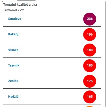 Inače, u narednim danima očekuje se dodatno pogoršanje kvaliteta zraka, naročito u kotlinama i nizinskim područjima Bosne i Hercegovine. Prema najavama meteorologa, stabilni vremenski uslovi bez jačeg vjetra pogodovat će zadržavanju zagađujućih čestica u prizemnim slojevima atmosfere.