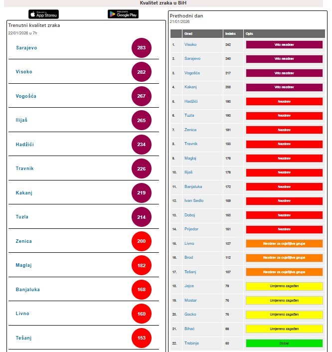 Prema mjerenjima jutros u 7 sati, u Sarajevu, Visokom, Vogošći, Ilijašu, Hadžićima, Travniku, Kaknju i Tuzli zrak je ocijenjen kao vrlo nezdrav, dok je nezdrav u Zenici, Maglaju, Banjoj Luci, Livnu i Tešnju.